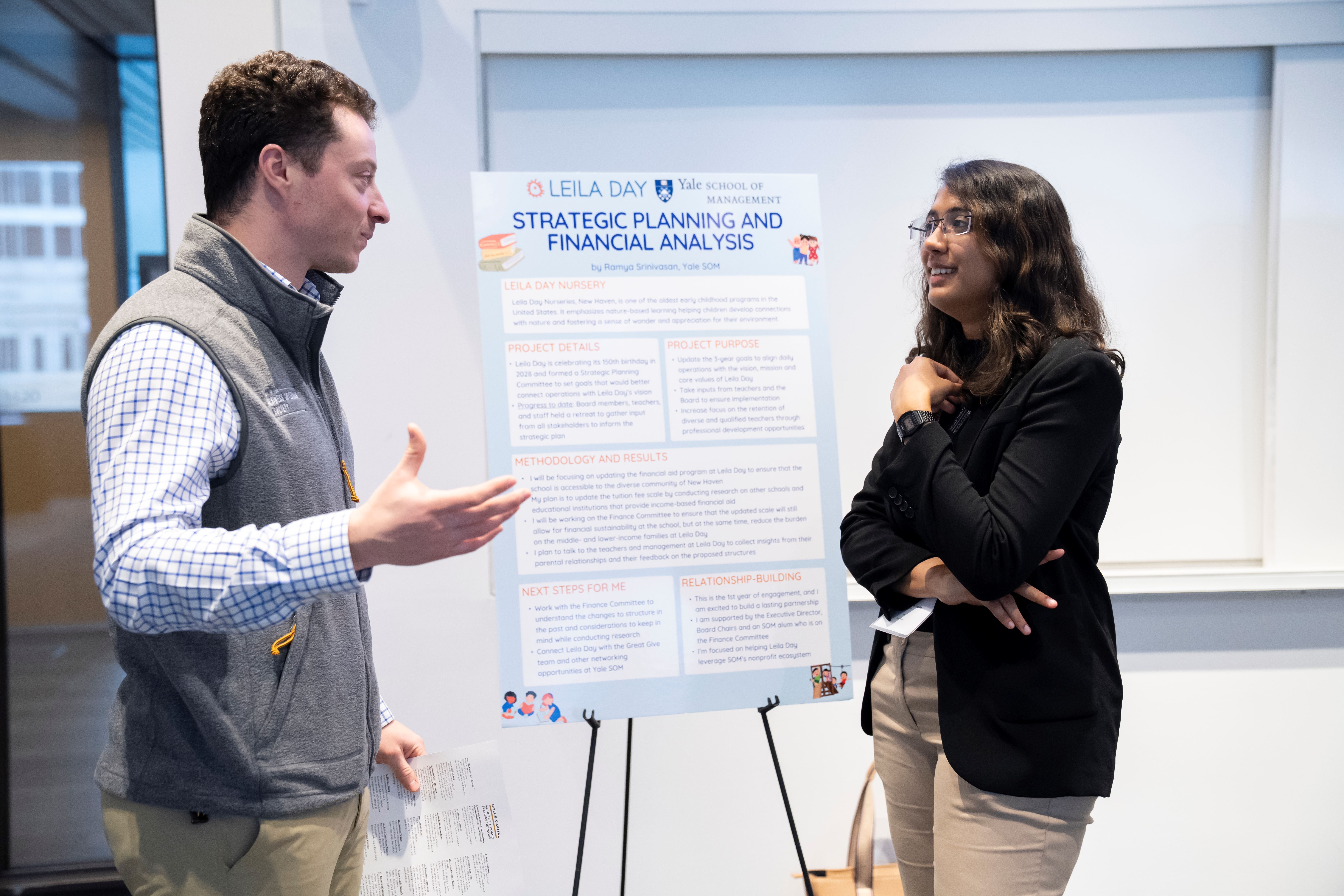 Faculty Director of the Yale SOM Program on Social Enterprise, Innovation, and Impact, Judith Chevalier, contributed insights on the convening’s program design panel, sharing lessons from SOM’s efforts to support and build its program. First-year student Ramya Srinivasan ’26 presented a poster outlining the capacity-building project she is pursuing with her board partner. Between sessions, participants huddled in breakout groups to swap templates, troubleshoot thorny governance issues, and crowd-source fresh ideas for impact measurement.